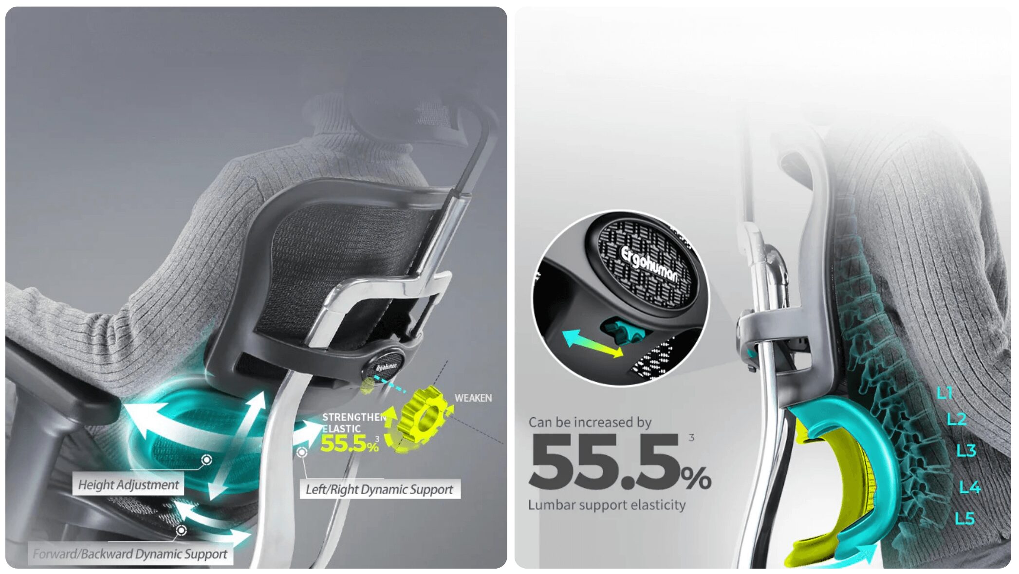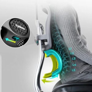 Ο σχεδιασμός της πλάτης μας επιτρέπει να ρυθμίσουμε το κάτω μέρος που στηρίζει την μέση μας με ακρίβεια ώστε να μας στηρίζει στα σωστά σημεία αλλά και με την αίσθηση που μας βολεύει. Η οσφυϊκή υποστήριξη είναι αρκετά ελαστική για να ακολουθεί την κάθε κίνηση του σώματος και μπορεί να ρυθμιστεί ώστε να είναι πιο σκληρή ή πιο απαλή ανάλογα με τις προτιμήσεις μας. Επίσης, η περιοχή της οσφυϊκής υποστήριξης παραμένει εύκαμπτη και στις κινήσεις μας δεξιά και αριστερά ώστε να μην μας περιορίζει να “στριφογυρίζουμε” πάνω στην καρέκλα ενώ ταυτόχρονα μας στηρίζει σε κάθε στάση.