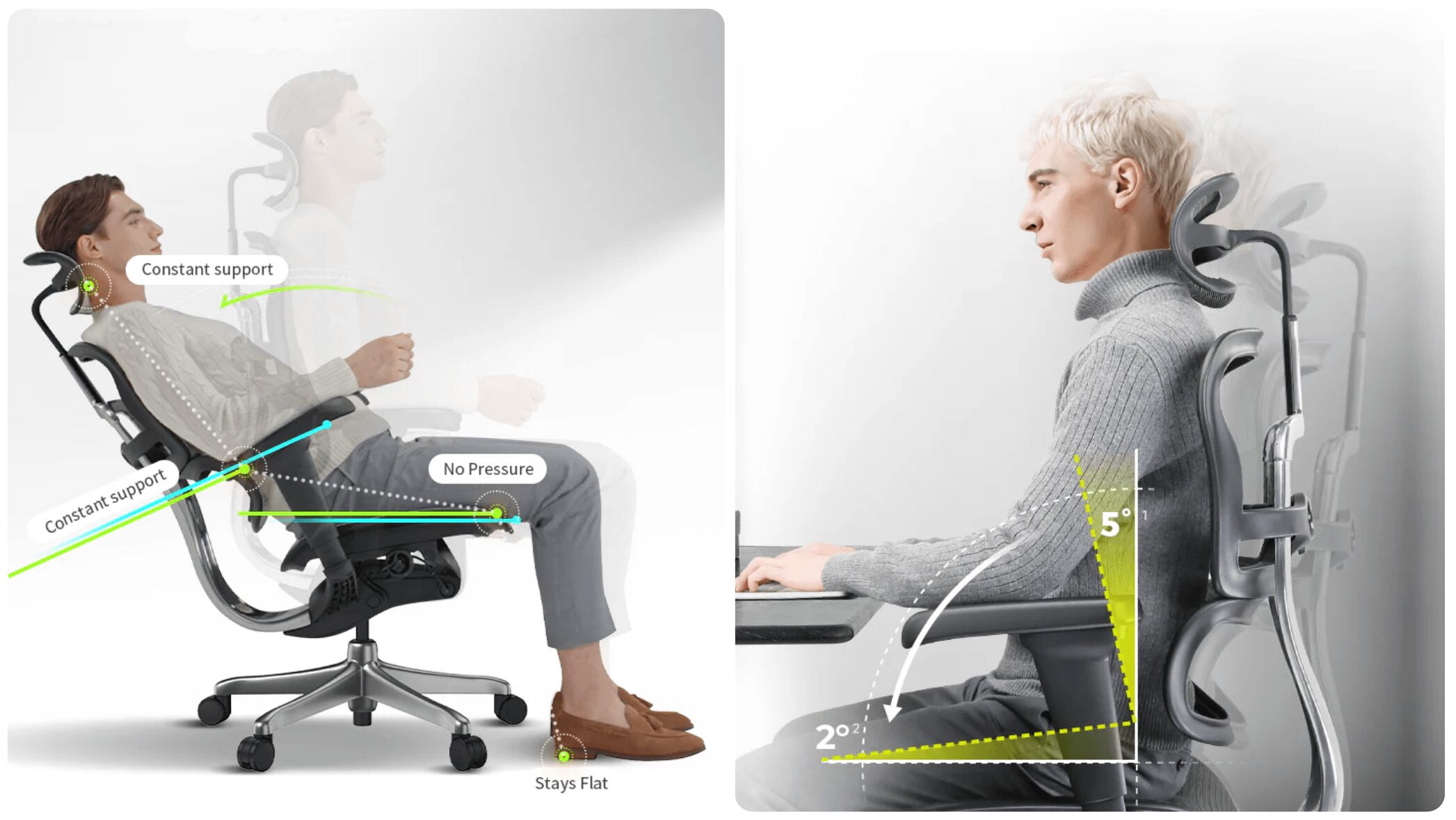 Η χρήση της καρέκλας “ξεκλείδωτης” και η κίνηση μας πάνω σε αυτή αποτρέπει την ακινησία και την ακαμψία των μυών. Η Ergohuman Eagle διαθέτει τον εξελιγμένο μηχανισμό ανάκλισης Synchro Drift Tilt προσφέροντας την τέλεια γωνία μεταξύ του κορμού και των ποδιών σε όποια στάση κι αν καθόμαστε. Φυσικά μπορούμε να τον κλειδώσουμε σε όποια θέση επιθυμούμε.